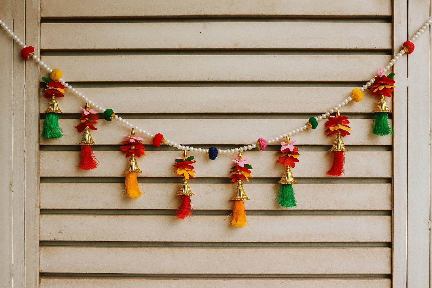 Adorn your entryway with this colorful handmade Toran. Featuring delicate faux pearls, bright paper flowers, and playful golden bells with multi-colored thread tassels, it's the perfect instant uplift for festivals, housewarmings, or any celebration. Brings an authentic, festive charm to any door or mantle.